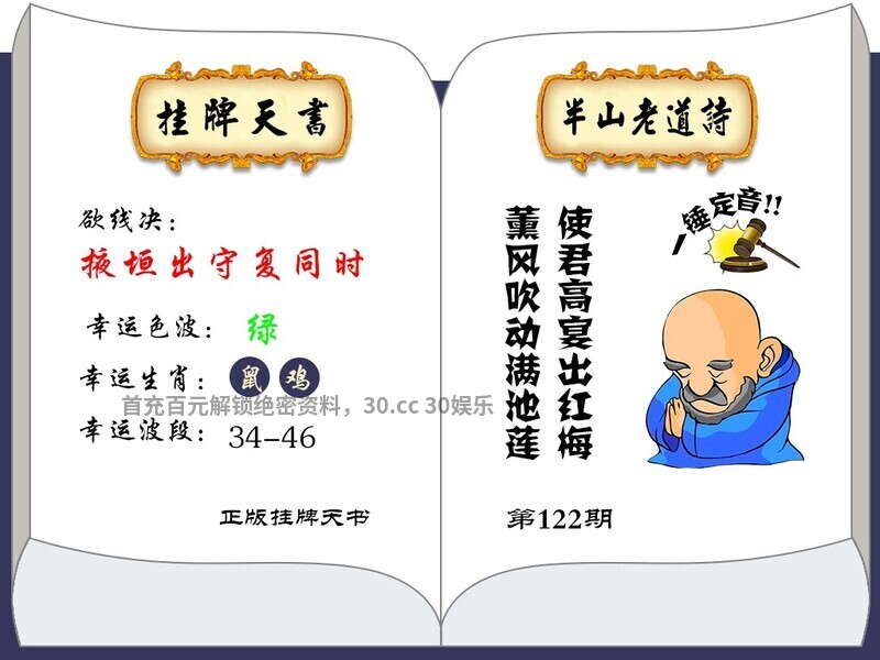 122期挂牌天书:开發00 薰风吹动满池莲,使君高宴出红梅 解:薰风吹动满池莲,解吉美生肖兔龙蛇马羊鸡,使君高宴出红梅,解红波 六肖:鼠马猪虎蛇猴 12码:06.18.12.24.07.19.04.16.13.25.10.22 幸运波色:绿波 幸运波段:34-46